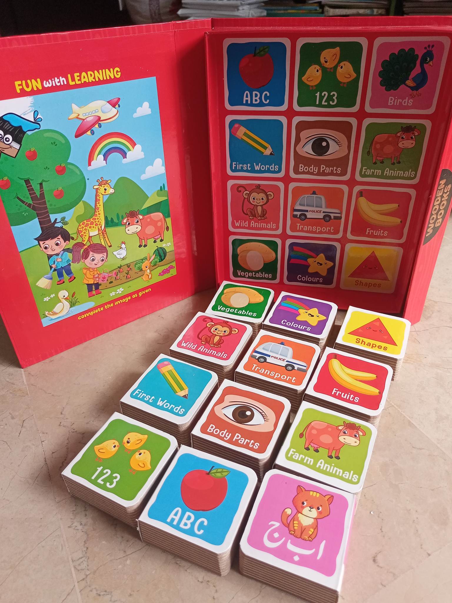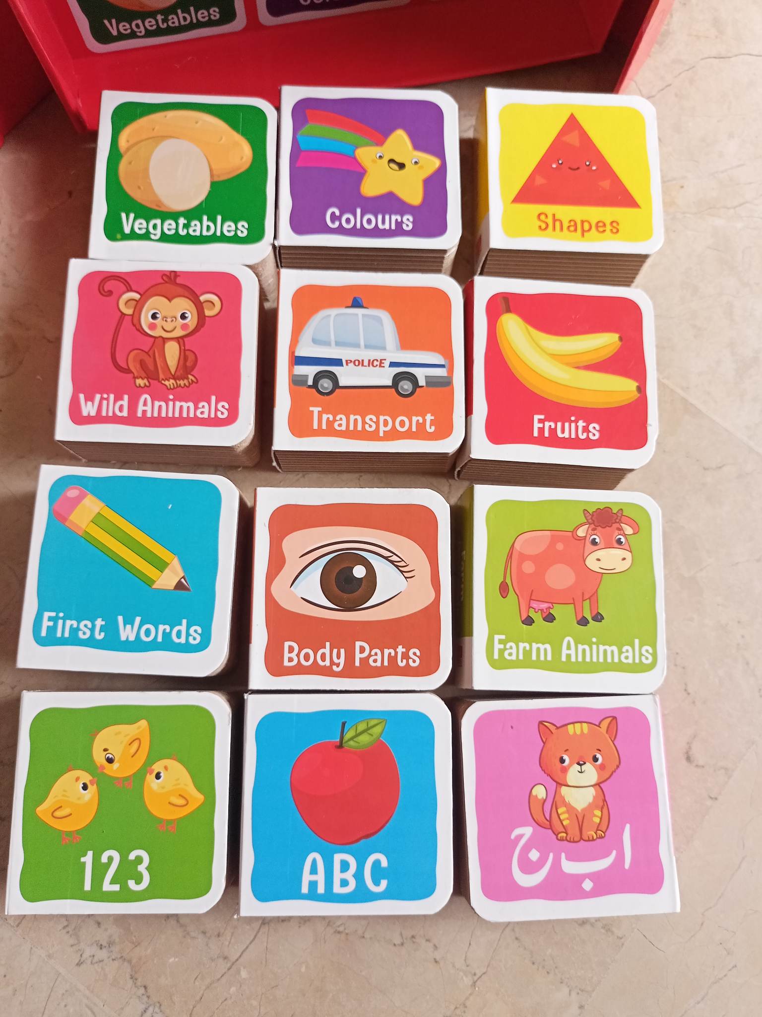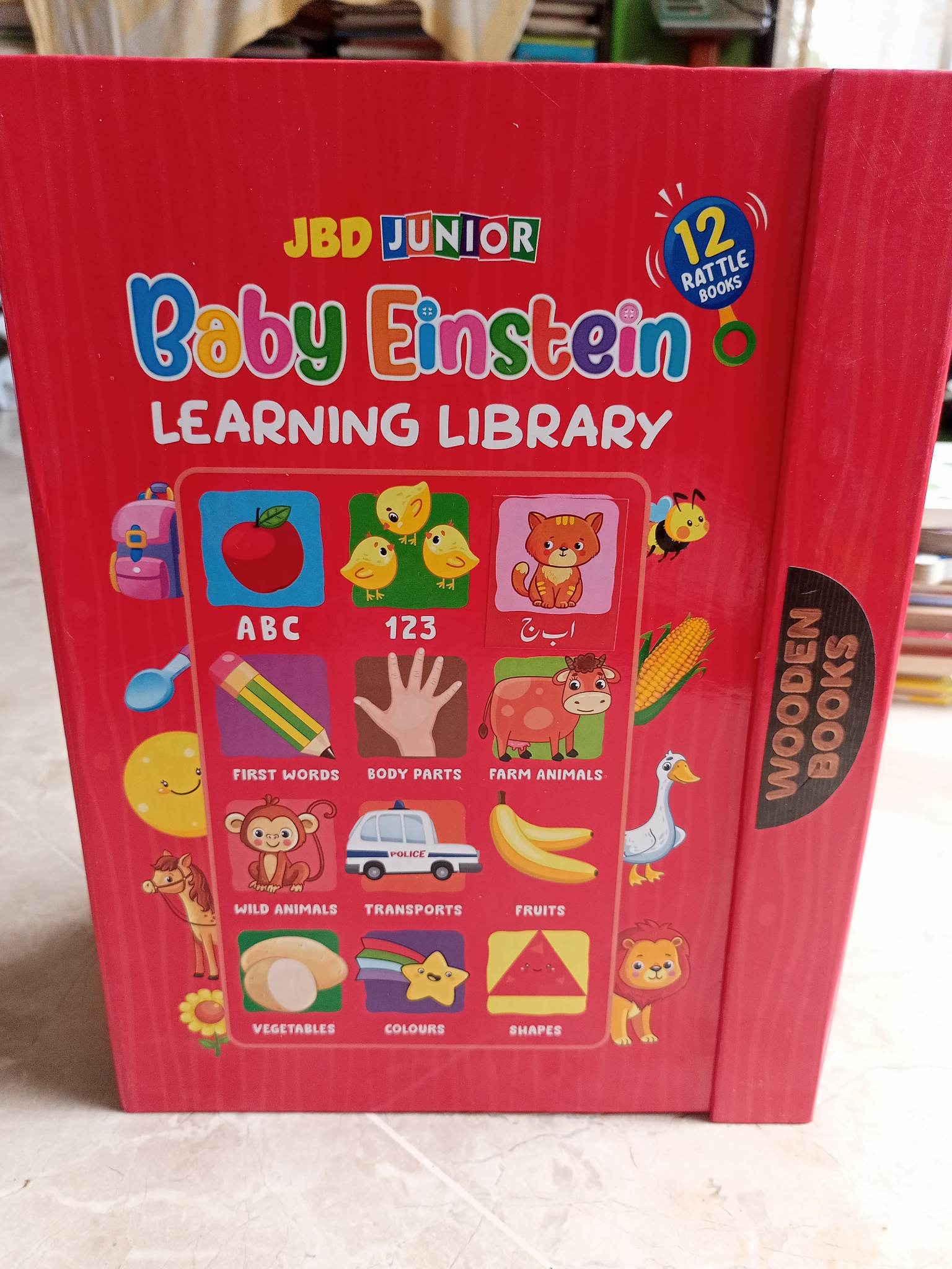 - This dazzling library set feature abrillent selection informative books.Desing make to learning fun and interactive,this valuable refrence material is a great way to sparks young children,s interest in reading.12 board books includes.my first words 123,ABC, body parts,transports,farm animals,wild animals,vegetables,fruits ,shapes ,colours and birds.