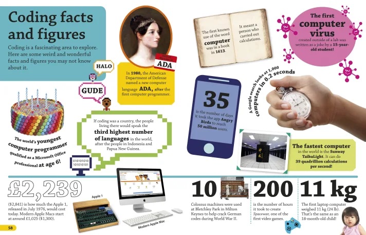 How much did the first laptop weigh? What exactly is a computer bug? How many calculations can the world’s fastest computer perform in a single second? Find out the answers to these questions and more in DKfindout! Coding, which features photographs and illustrations of gadgets, games, and coding geniuses like Ada Lovelace and Alan Turing. Beginning in the mid-1800s, readers can trace the path of coding pioneers from the birth of the first computer all the way to today’s tech boom. Along the way, they’ll learn about the fundamentals of coding languages like Java and Python―including their application in everything from cars to calculators―and how coding continues to revolutionize tech, gaming, medicine, space travel, and more.