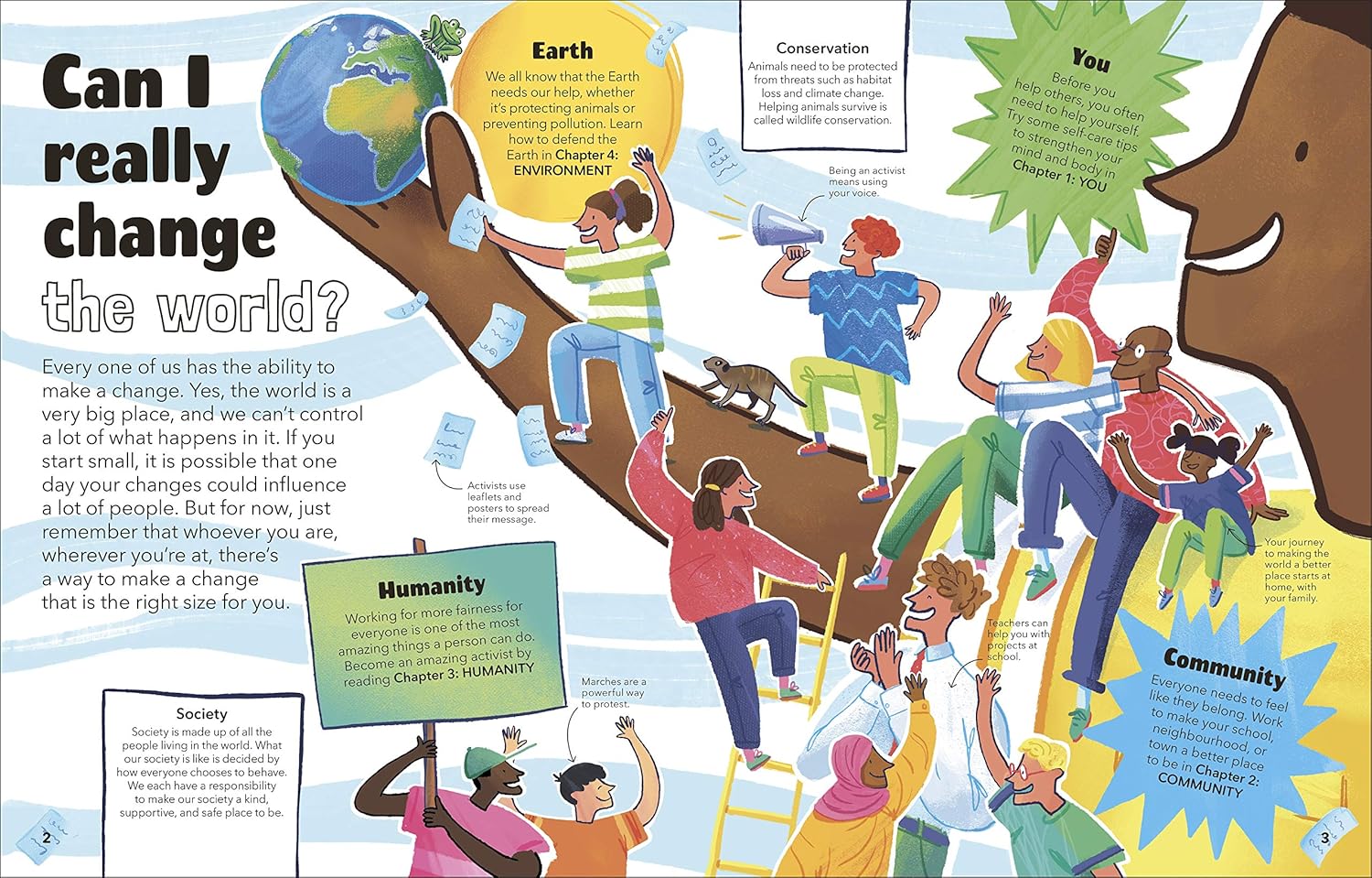 Brightly illustrated inclusive art makes this factbook as visually appealing as its message. You can easily jump around without any loss of comprehension and dip in for short or longer periods. Learn about tricky social interactions like friendship fallouts, or bullying and how to maneuver them, or find out how to go about creating activist campaigns to tackle climate change or social injustice.