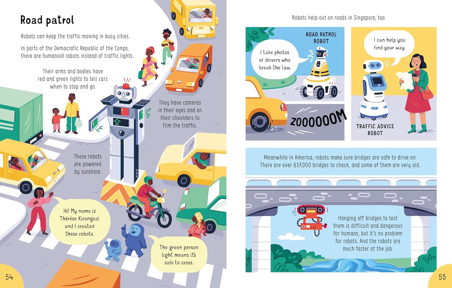 You’ll never guess how tiny robots are helping bees, where giant robots are stopping traffic, what kinds of intrepid robots are exploring outer space and how clever robots learn to beat chess champions. Discover all this and lots more things to know about what robots can do, how they are designed and programmed and the part they will play in our future.